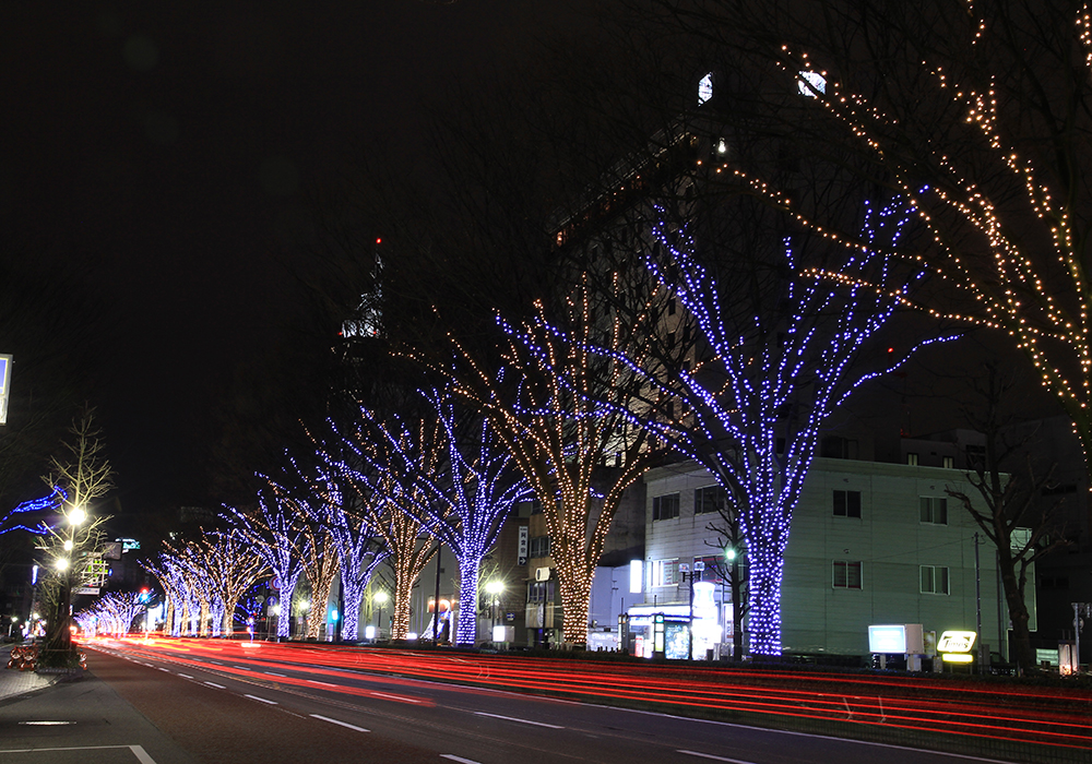 富山駅南口から城址大通りまでの約1kmの街路樹とオブジェが、約10万球のイルミネーションに包まれます。イルミネーションに彩られた街路樹はまるで光のトンネルのよう。公園の噴水にイルミネーションの光が反射する様子はロマンチックな雰囲気を盛り上げます。カップルはもちろん、ご家族でもお楽しみいただけるイベントです。