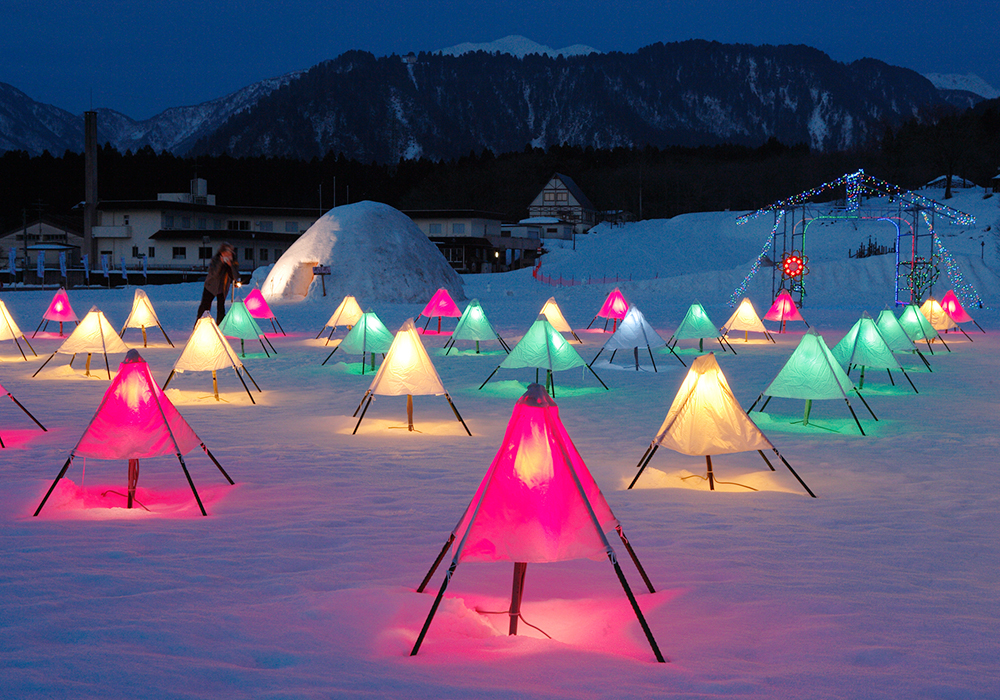 樹木のライトアップやイルミネーションで一面雪景色の立山山麓が幻想的に彩られます。打ち上げ花火やスリル満点のスノーラフティング、雪上フットサルなど楽しい催しが盛りだくさんです。