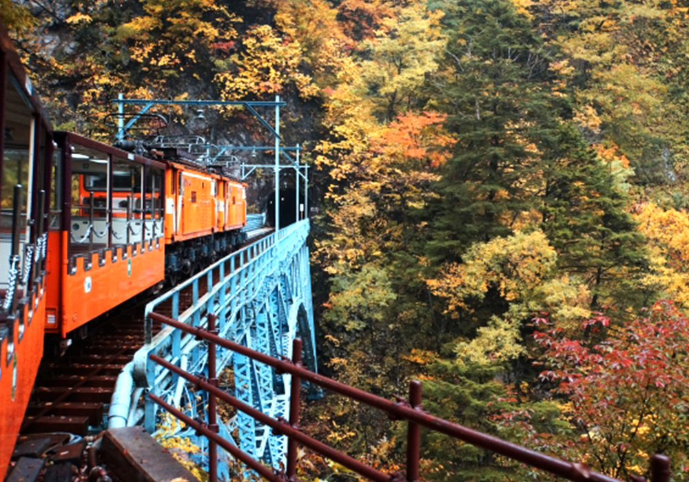 いくつもの橋やトンネルを抜けながら大自然を駆け抜けるトロッコ電車の車窓からは、美しい黒部峡谷の景色を眺めることができます。黒部峡谷は、国の特別天然記念物および特別名勝に指定されており、日本の三大渓谷、日本の秘境百選に選ばれています。紅葉に敷きは鮮やかな紅葉の赤と、常緑樹の緑の美しいコントラストを楽しむことができます。