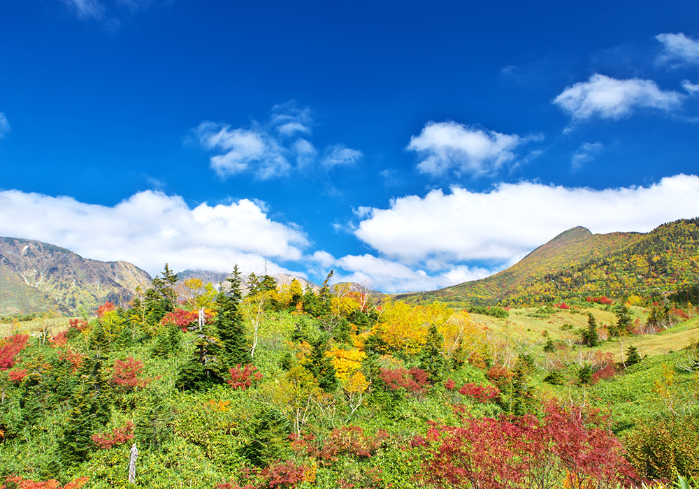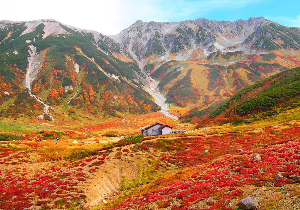 立山の紅葉は、赤や黄色だけではなく、ハイマツの濃緑やチシマザサの淡緑など、豊富な色彩が特徴です。赤いナナカマドやミネカエデなどの黄色の紅葉は、9月下旬から11月上旬の約1ヶ月半かけて山頂からふもとへと広がっていきます。