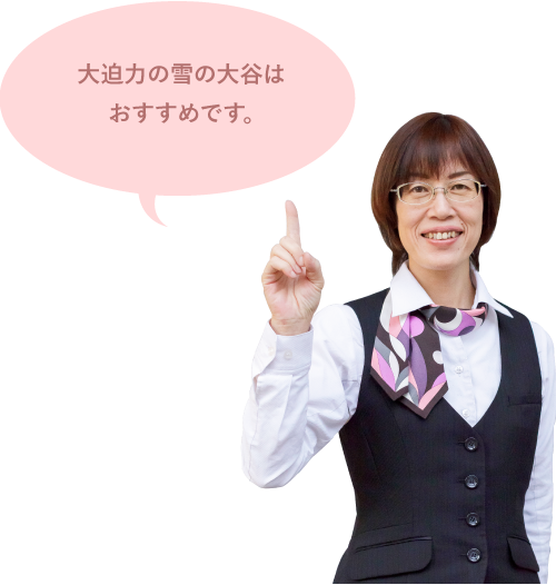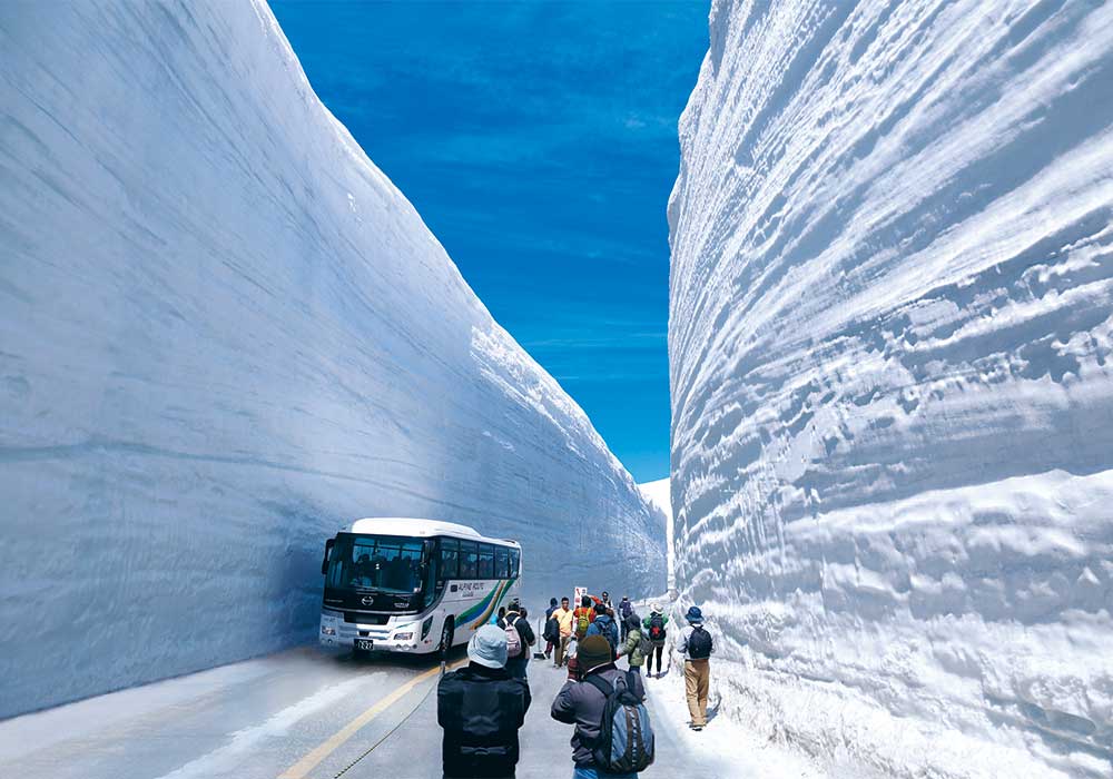 雪の大谷、雪の壁など大自然が織りなす究極の天然美をお楽しみいただけます。