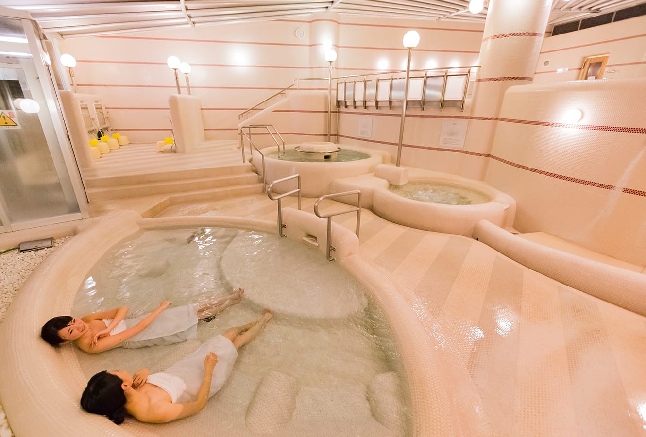 広い空間の内風呂にはジャグジーや寝湯、箱風呂、サウナなど多彩に楽しめる浴槽が並び、